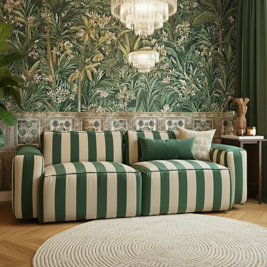 Вдохновлённый современными итальянскими интерьерами, Диванua Cavo Raya Green сочетает минимализм и классическую изысканность. Вертикальные бело‑зелёные полосы создают смелую визуальную игру, которая преобразит гостиную, элегантное коммерческое пространство или дизайн‑студию.