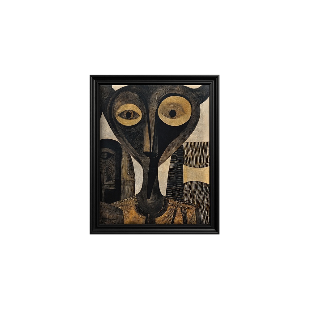 „Ancestral Beings” — глубоко символичная композиция. Здесь лица не портреты, а сущности. С большими асимметричными глазами, удлинёнными чертами и тщательно выведенными графичными контурами эти фигуры выглядят как древние духи — стражи старого мира, забытого временем, но всё ещё живущего в коллективном подсознании. Текстура artwork, почти как гравировка, создаёт ощущение слоистости — будто мы смотрим через несколько эпох визуальной памяти. Явного фона нет: присутствуют лишь фигуры, которые переплетаются, накладываются друг на друга и смотрят друг на друга, а также на нас. Тона охры, коричневые и глубокие чёрные оттенки подчёркивают духовный характер работы и формируют пространство для размышлений, а не просто декоративную поверхность. Фигуры молчаливы, но тревожны — они не выражают себя мимикой, а говорят своим присутствием. Часть коллекции Africa, „Ancestral Beings” — artwork о первичной идентичности, о корнях, которые нельзя отрезать, и о той части нас, что всегда остаётся связанной с племенными истоками человечества.