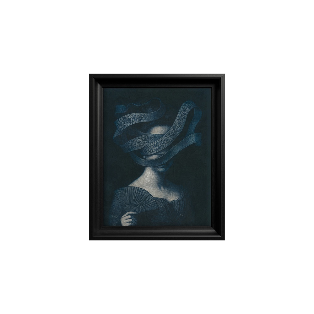 Фигура в центре — благородная дама, частично скрытая богато украшенной лентой, которая парит в графической игре форм и теней. Вызывая ассоциации с тайной и скрытой красотой, композиция превращает зрителя в участника истории — приглашая его разгадать личность и эмоции, скрывающиеся за символическим вуалем. Нежный веер, удерживаемый с грацией, придаёт театральную и женственную нотку, дополняя ауру аристократической элегантности.