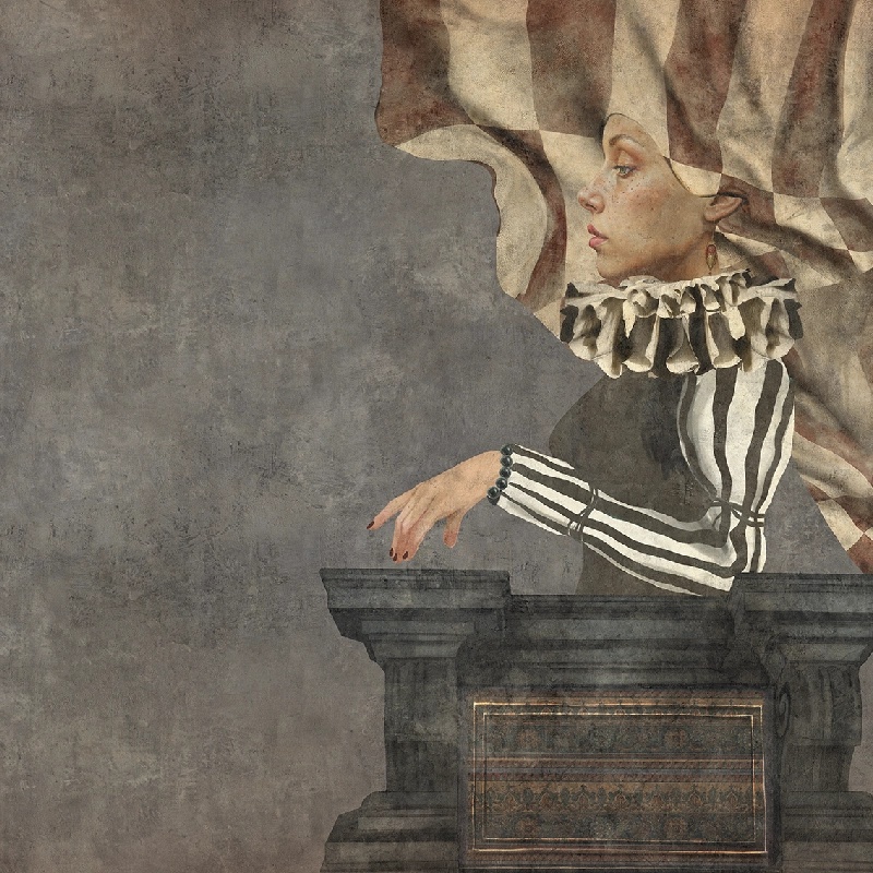 Женщина с тонкими чертами и безупречной осанкой доминирует в композиции. Её присутствие притягивает взгляд. Тонкая линия профиля подчеркнута едва заметным контрастом света и тени. Это выявляет и силу, и хрупкость, присущие образу. Пьедестал здесь символичен — он одновременно дань уважения и оковы.