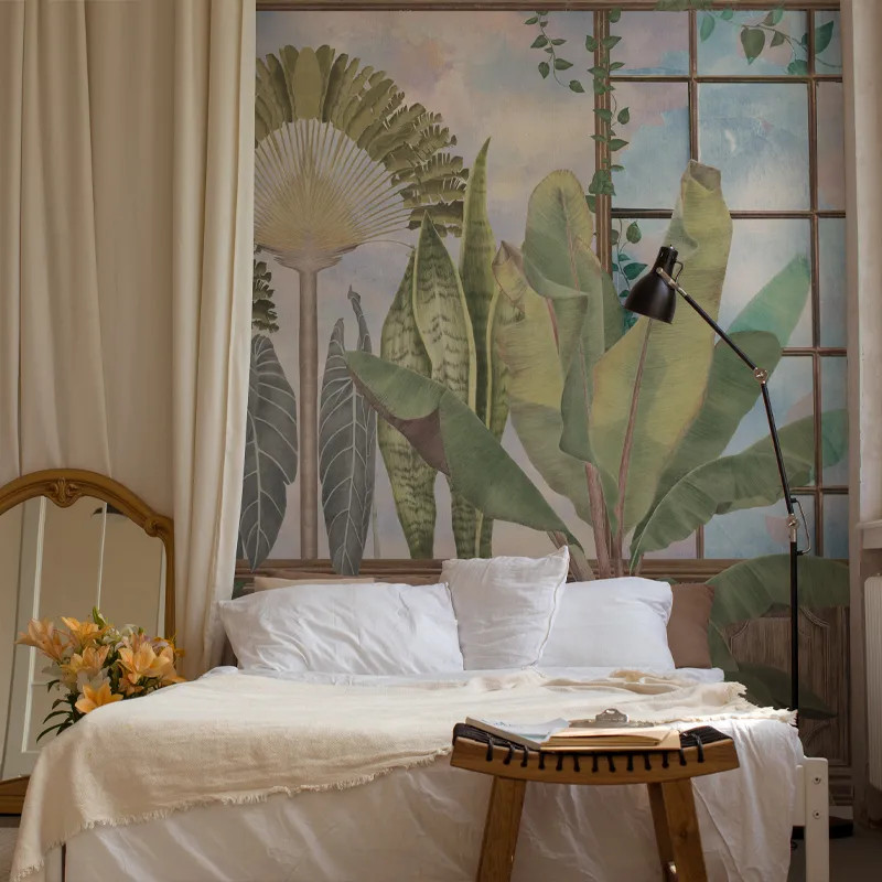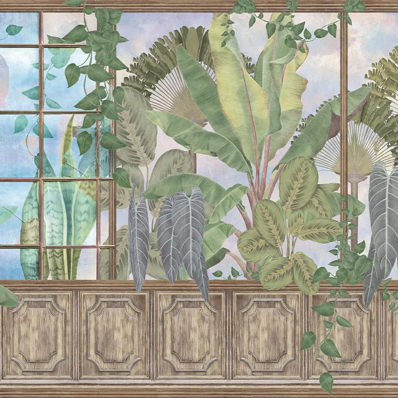Дизайн обоев Arboretum создаёт очень элегантную атмосферу. Здесь главную роль играют крупные листья экзотических растений. Рамы из массива с декоративными накладками придают композиции винтажный стиль. Тщательно прорисованные стекла добавляют прозрачности и текстуры. Они придают сцене ощущение подлинности.