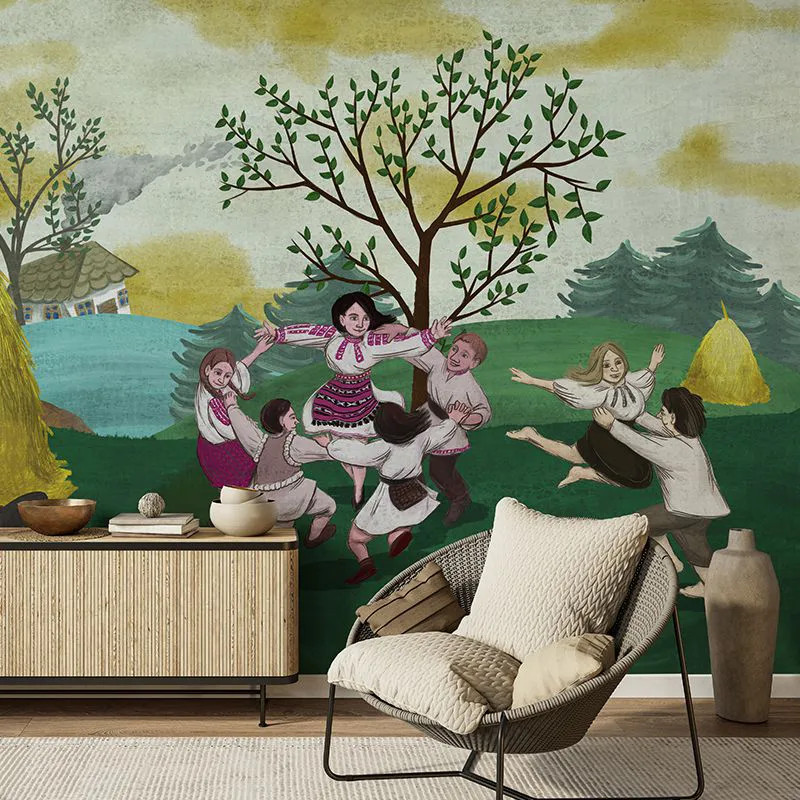 Модель Обои Cheflii — тёплая история. Её хранили в сердцах поколения людей, кому посчастливилось пережить её. Традиционная румынская деревня с её обрядами и обычаями кажется волшебной. Её украшают живые темы и мотивы. Обоиul Cheflii создан как дань народным мастерам. Они искренно и открыто творили в стиле наивного искусства. На переднем плане — сцена, где переплетаются радость, невинность и наслаждение жизнью. Люди наслаждаются целительной силой танца. Танец очищает сердце и делает душу чистой. Пляска хоры имеет особое символическое значение. Она связана с древним обожествлением soarelui, архетипического элемента, наделённого силой бессмертия. Обои также передают идею важности общины. Они показывают, как люди празднуют вместе: единение душ происходит через семью, друзей и соседей, а также в паре — через любовь.