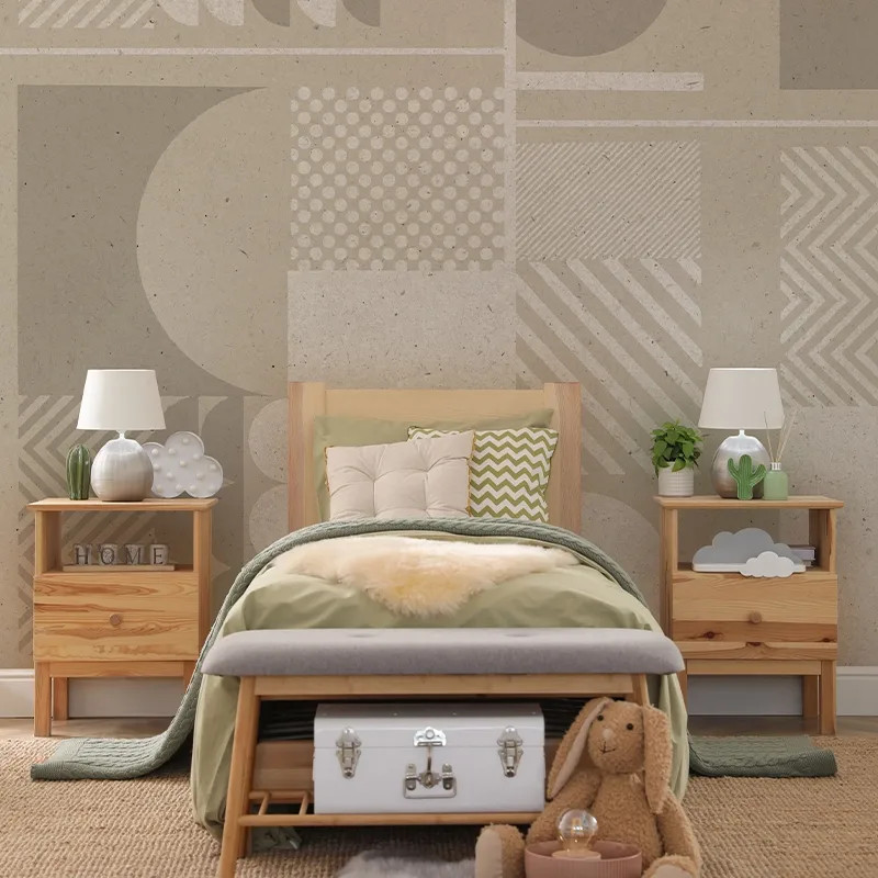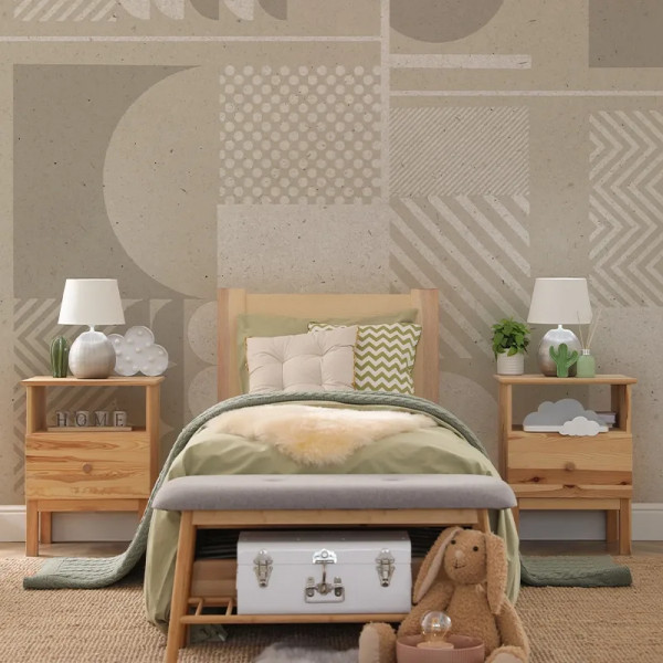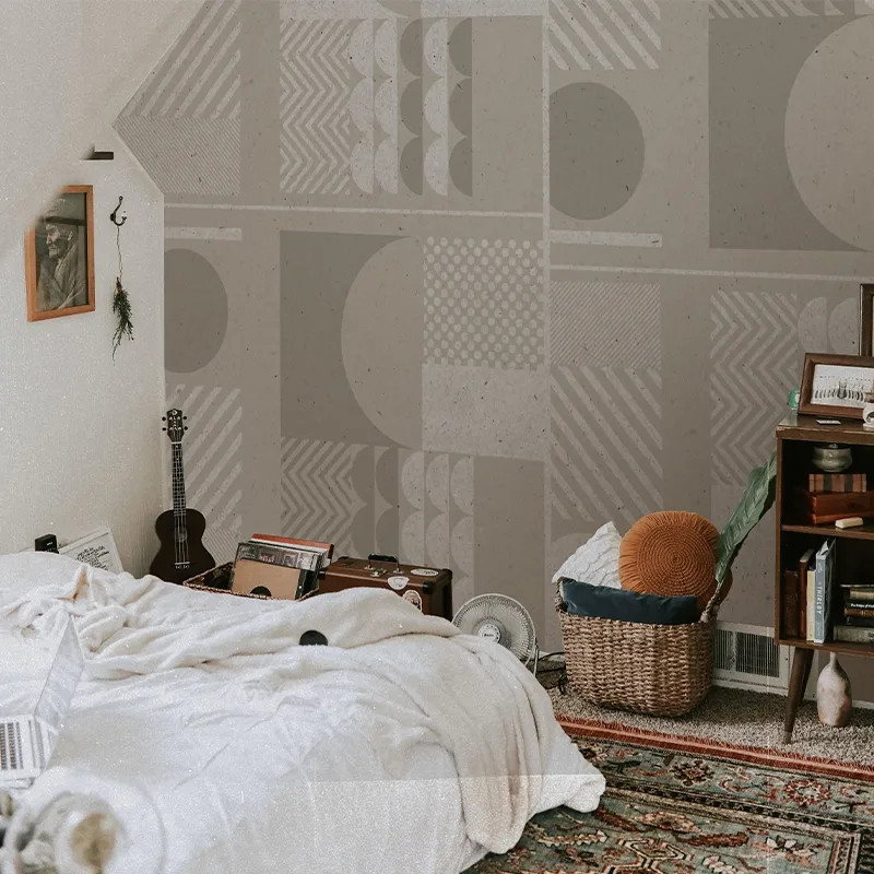 Если вы оклеите только одну стену, чтобы создать фокус в комнате, подберите декор в тех же тонах, что и обои. Подойдут шторы или занавеси белого либо бежевого цвета. Для завершения образа выберите ковёр из натуральных материалов нейтральных оттенков. Эти обои также отлично смотрятся на всей поверхности комнаты. Благодаря сдержанной палитре и геометрическим элементам они придают интерьеру выразительность.