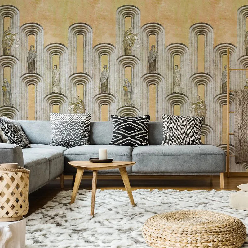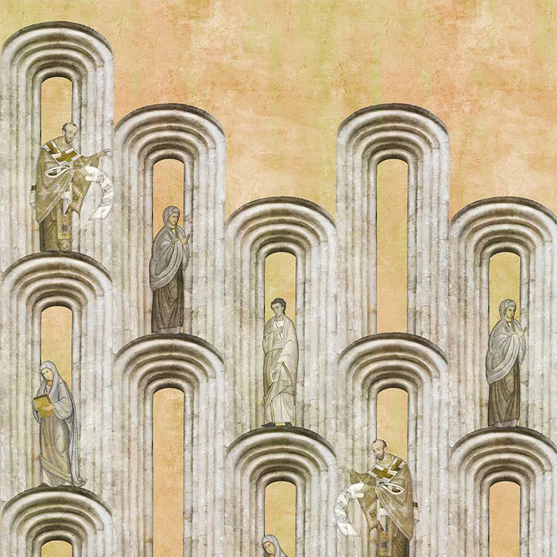 Modelul de Обои Locuri Sfinte (anafura) создаёт на стене атмосферу внутреннего покоя и тишины многовековой. Devine, astfel, o сцена в которой обитает религиозное измерение нашего народа, мистический фундамент традиционного румынского. Вдохновение для этой модели заключается в нашем путешествии по стране, воспринятом как поиск забытых или скрытых корней, а также красоты, изображённой на иконах в местных церквях. Ne-am delectat, astfel, cu frescele в рамках которых введены фольклорные орнаменты, характерные для нас как народа. Присутствие библейских фигур, изображённых естественным образом и вдохновенно, приносит хвалу и благодарность церковным художникам. Пояса и украшения из камня, ниши, обрамления или арки получают цветочные или растительные детали, с восточными элементами, гармонично переплетёнными с местными. Modelul de Обои Locuri Sfinte нацелен на то пространство общее, золотое сияние присутствует во всём и в каждом, что делает нас, одновременно, более человечными и более божественными.
