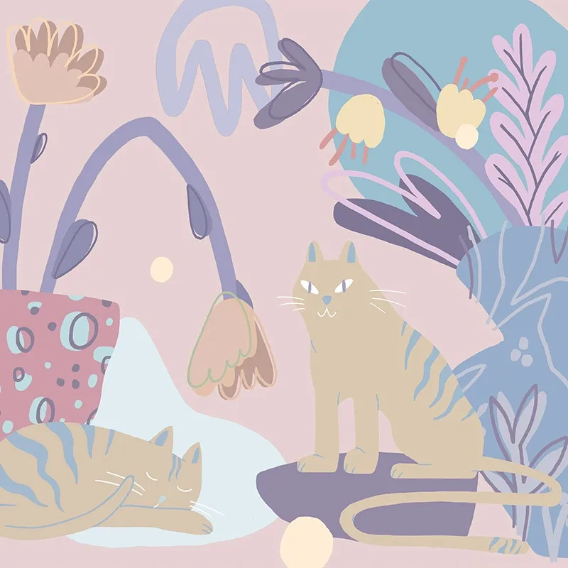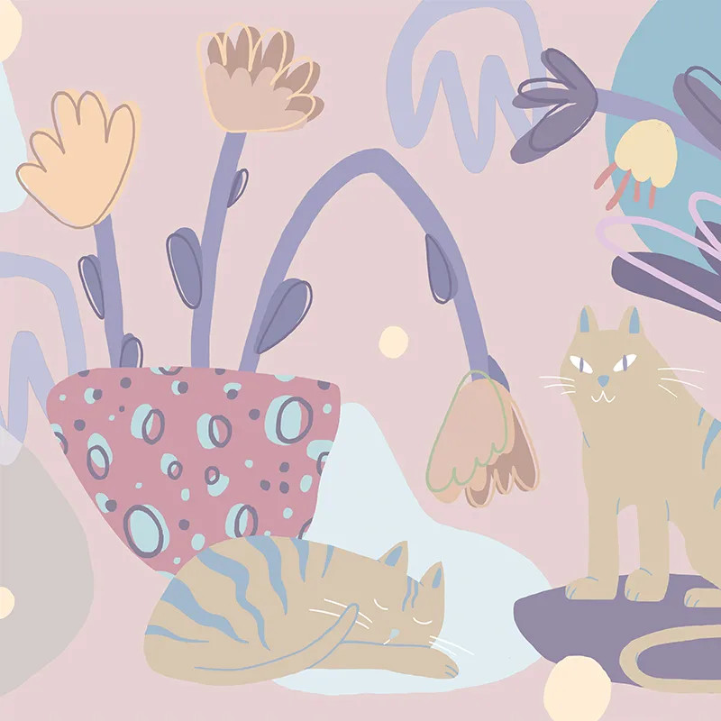 Дизайн Minous выполнен с такими же лёгкими деталями, как и сама атмосфера. Несколько элементов — кошки, стилизованные цветы и горшок — оставляют пространство, чтобы цветовая палитра проявила себя. Пастельные оттенки розового, фиолетового, бежевого и голубого гармонично сочетаются. Они точно передают настроение, которое мы задумали.