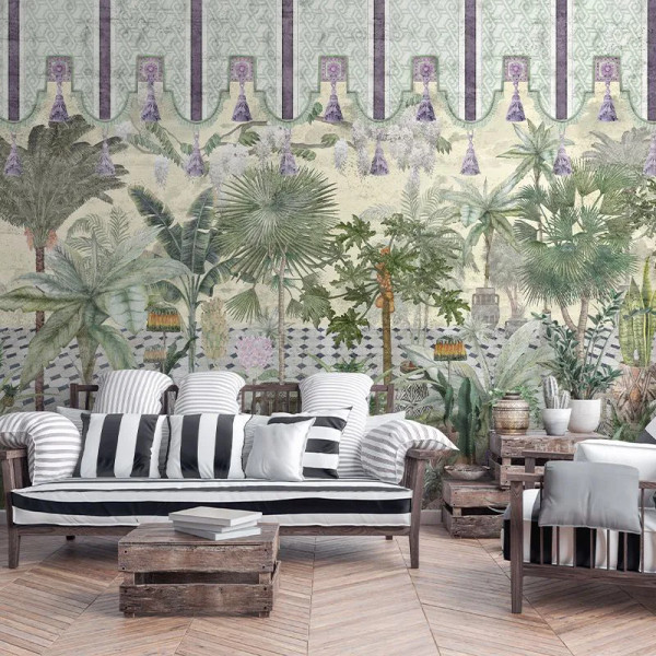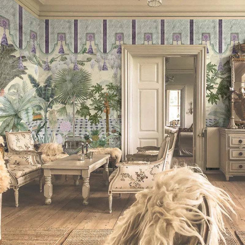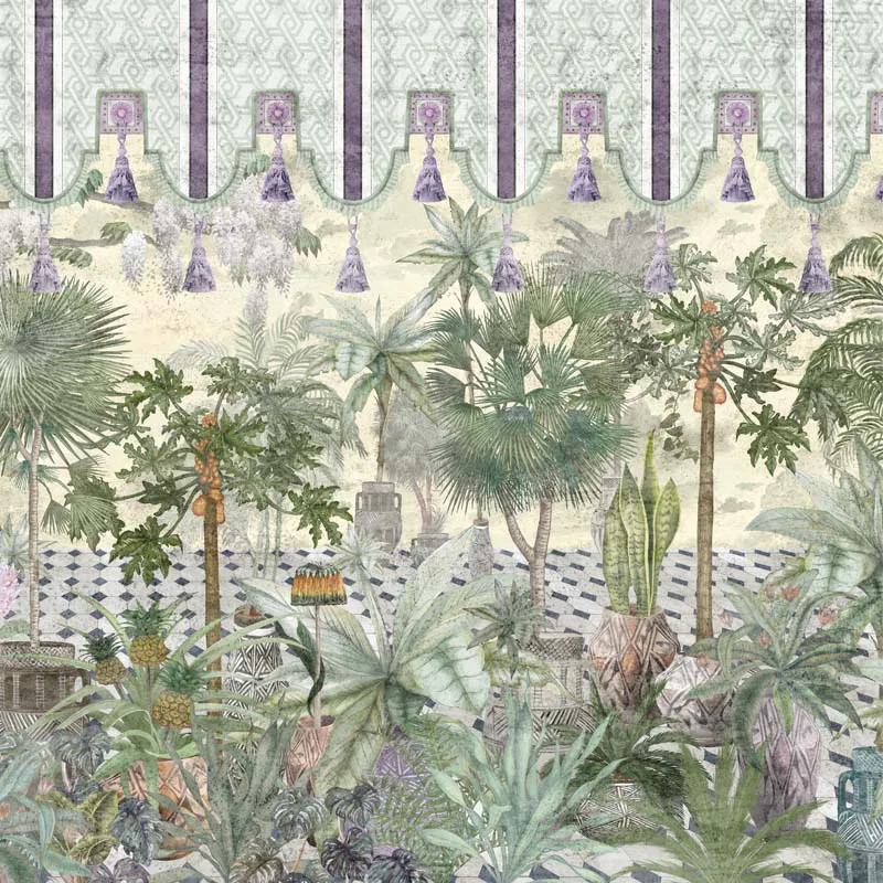 Дизайн обоев Parlour Tropicale приглашает вас в яркую, живую историю. Широкий коридор, который слуги натирают ежедневно, хотя давно не используют как проход. Иногда кажется, что это скорее место хранения для всех растений хозяев. Их экзотическое происхождение видно по тысячам цветов, что прорастают в каждом уголке замка. Горшки из стекла, мрамора и глины содержат кусочки джунглей, окружающих дом. Их торжественно приняли в доме, словно они здесь живут.