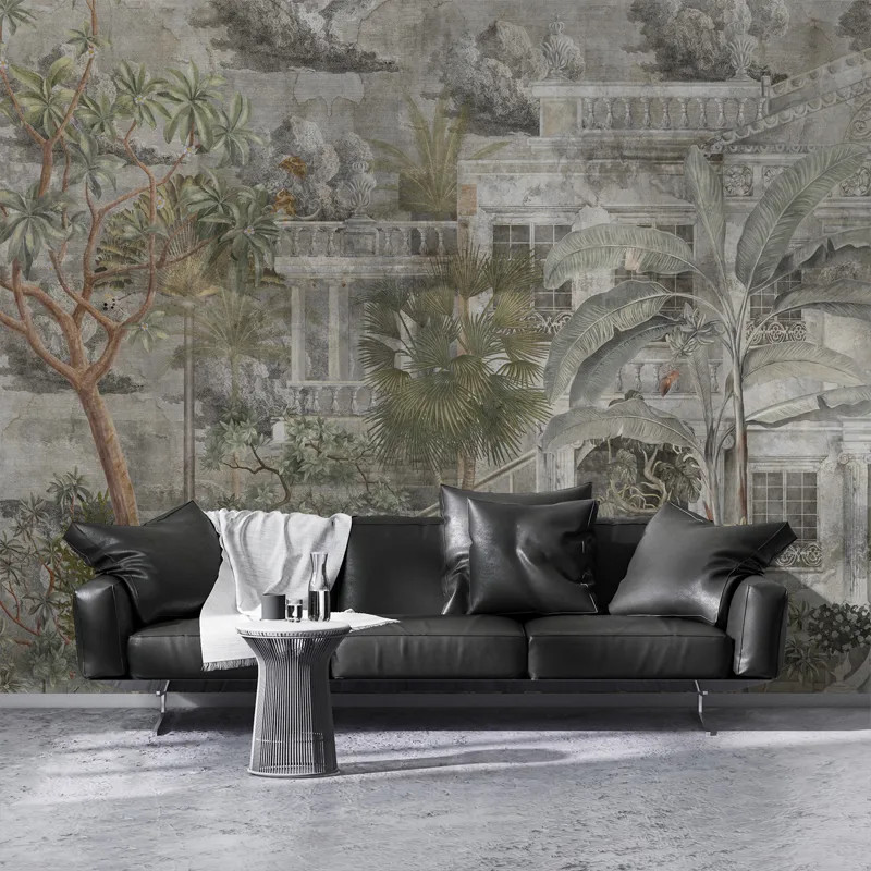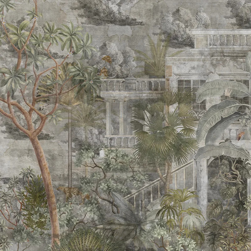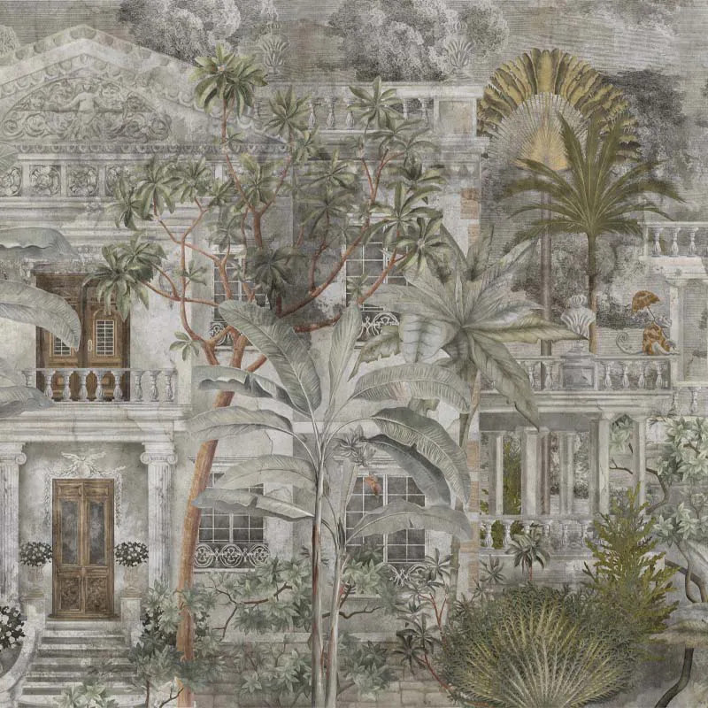 Дизайн обоев Stucatto Castle выполнен в чёрно‑белой и серой гамме. Единственные цветовые акценты — растительные элементы и деревянные входные двери. Благодаря этому он подходит для интерьеров в любом стиле. Обои придают пространству таинственную, элегантную и изящную атмосферу.