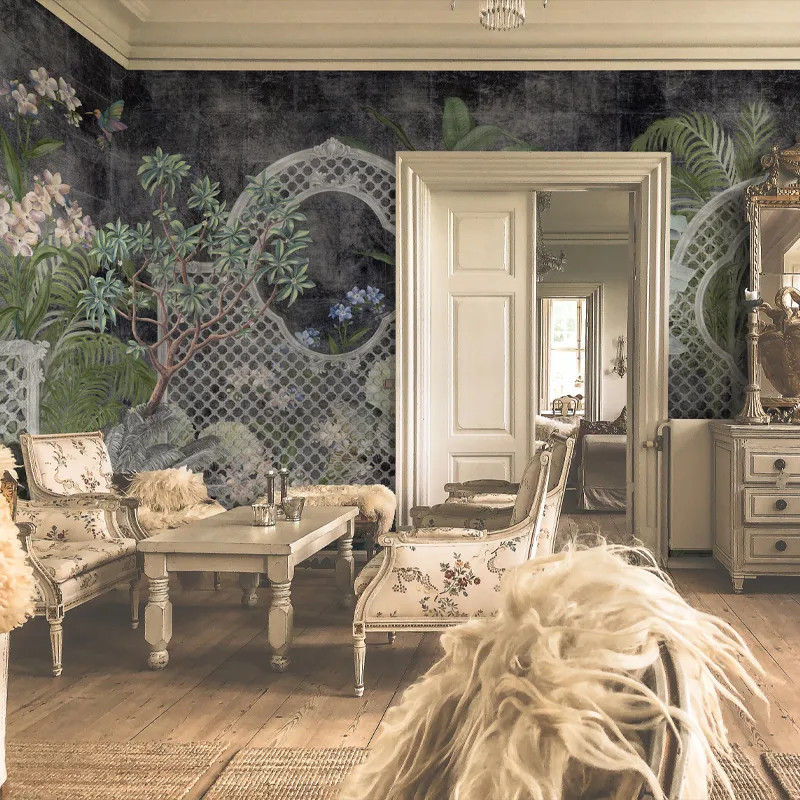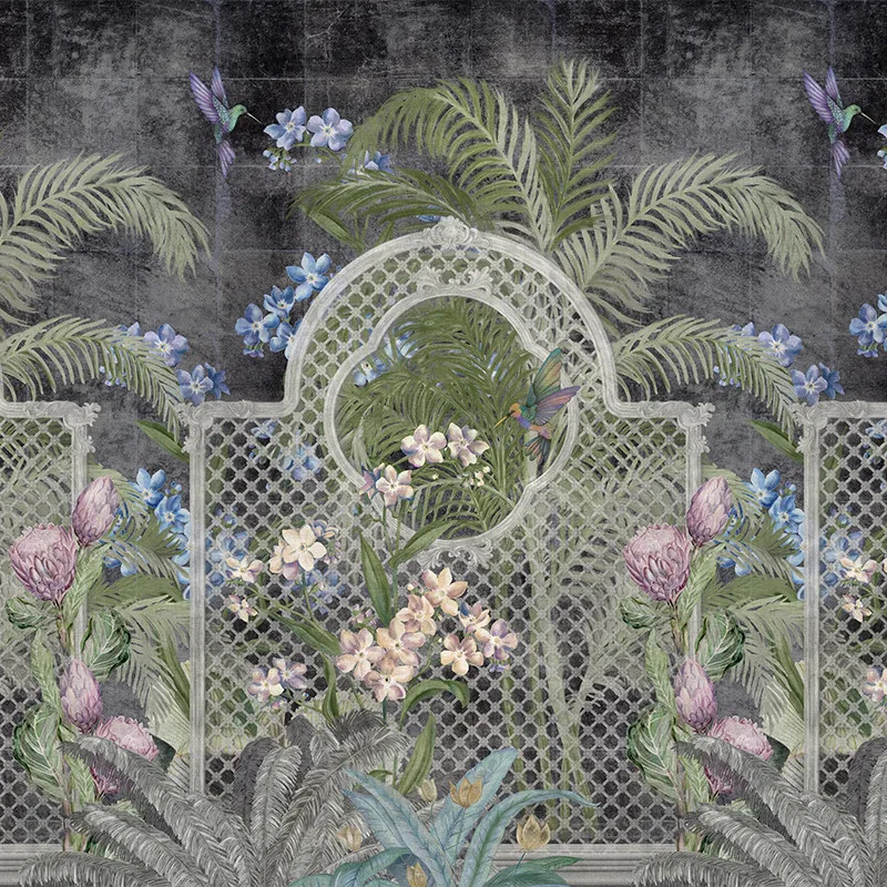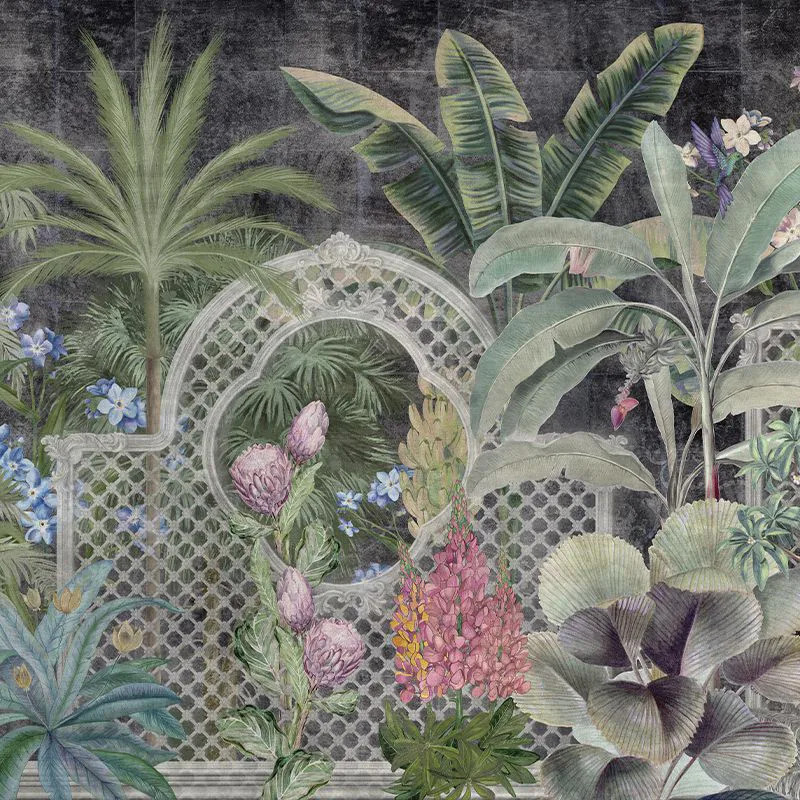 Мотив обоев Verdant Mosaic (dark) стилистически находится на грани между эклектикой и индустриальным стилем. Растительные элементы прорисованы с максимальным вниманием к деталям. Они нежные и женственные, с круглыми плавными формами. На контрасте фон выполнен в виде высокой стены, напоминающей цементную плотину. Противоположности связаны ажурными воротами, через которые можно заглянуть за них.