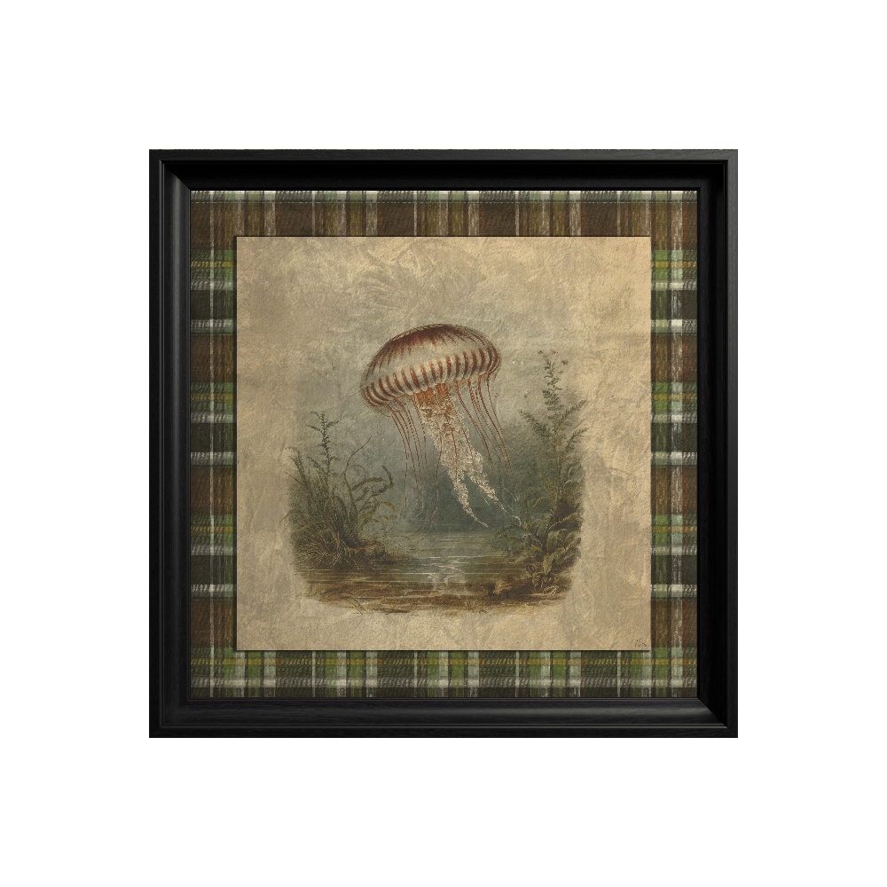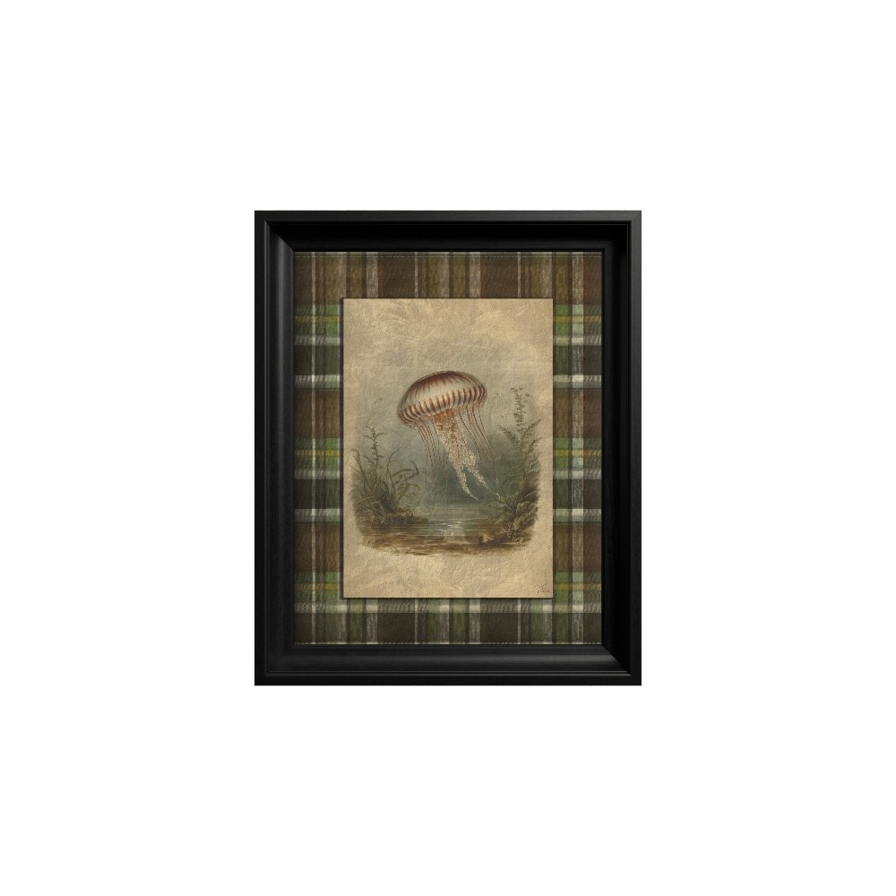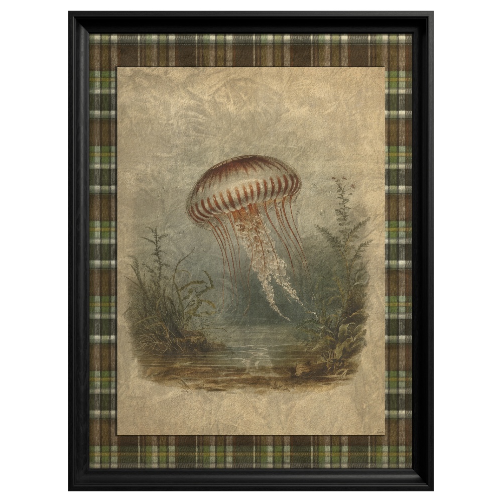 Fundalul geometric de tip tartan în carouri adaugă o structură vizuală necesară, echilibrând formele fluide ale subiectului marin. Protejat de o ramă neagră solidă, acest tablou din colecția "Heritage Menagerie" este o alegere rafinată pentru dormitor sau baie, inspirând o stare de calm, plutire și visare.