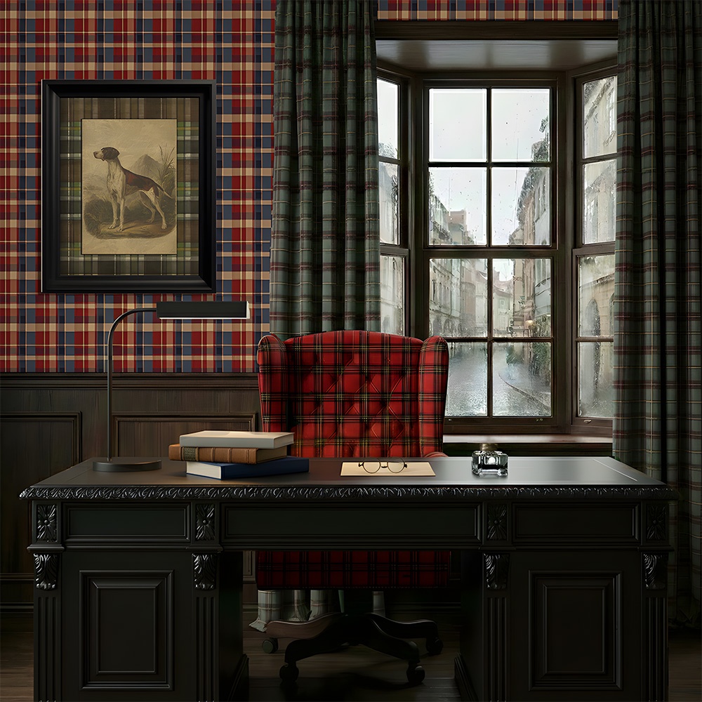 - Birou clasic (Home Office): Așa cum ilustrează imaginile de ambianță, tapetul "Galloway" creează o atmosferă serioasă și distinsă, perfectă pentru concentrare. Se asortează superb cu un birou din lemn masiv vopsit în negru și un fotoliu tapițat în același model tartan, oferind un fundal elegant chiar și în zilele ploioase.