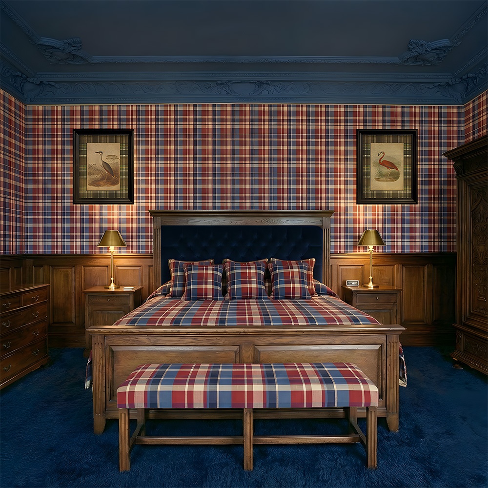 Datorită paletei sale bogate, acest tapet tartan roșu se adaptează minunat în interioarele care pun accent pe lemn și materiale naturale:
