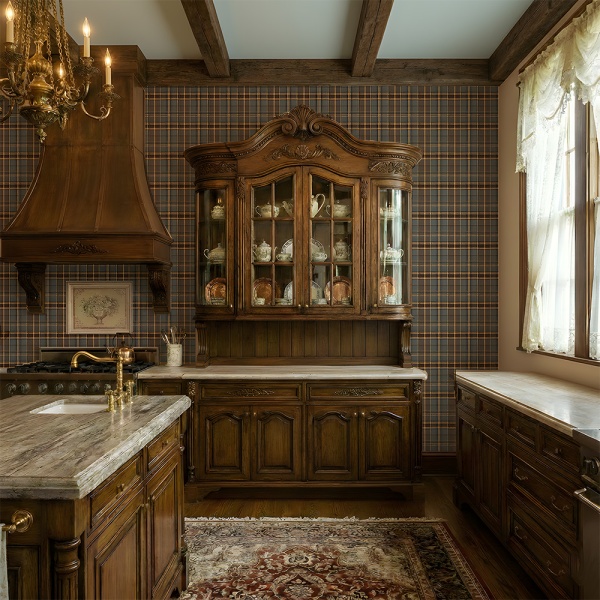 - Bucătărie "Manor House": Așa cum ilustrează imaginile de ambianță, tapetul "Inverness" completează superb o bucătărie impunătoare. Se asortează perfect cu mobilierul din lemn masiv sculptat (stejar sau nuc) și blaturile din marmură, creând o atmosferă de conac istoric, unde tradiția culinară întâlnește luxul.